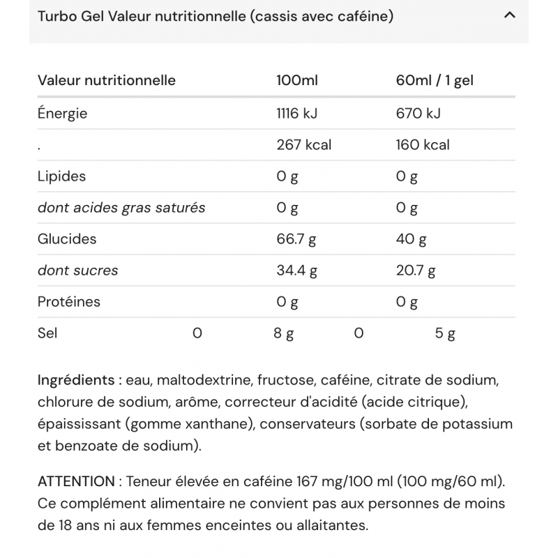 Le Gel Turbo Cassis Cafëine d’Amacx est un gel sportif prêt à l'emploi auquel de l'eau a déjà été ajoutée. Ce gel contient plusieurs sources d'hydrates de carbone à libération progressive (rapport hydrates de carbone 1:0,8). Disponible dans les saveurs Citrus, Cola Lime et Cassis Caféine.