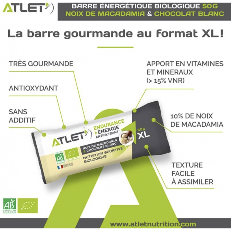 La barre énergétique biologique noix de macadamia & chocolat blanc ATLET est formulée avec des matières 1ères 100% biologiques sélectionnées avec soin et excluant des ingrédients inutiles (additif, conservateur, agent de charge…) à la pratique sportive.