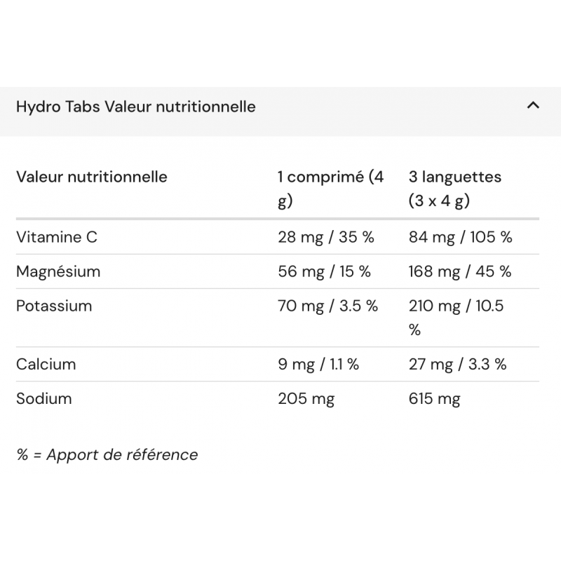 Les Comprimés Hydro d’Amacx sont utilisés pour reconstituer les sels et les minéraux. Ces comprimés contiennent du magnésium, de la vitamine C, du potassium, du sodium et du calcium. Les Hydro Tabs ne contiennent pas d'hydrates de carbone. Cette boisson favorise l'équilibre électrolytique et la vitamine C apporte un supplément d'énergie en cas de fatigue. Les comprimés se dissolvent dans 500 ml ou 750 ml d'eau. Disponible dans les saveurs fruits des bois, citron vert et orange.